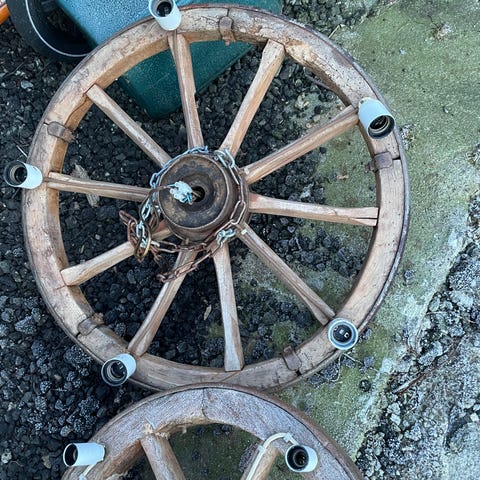 Stort gammel kjerrehjul 95cm i diameter. Laget av metall og tre.