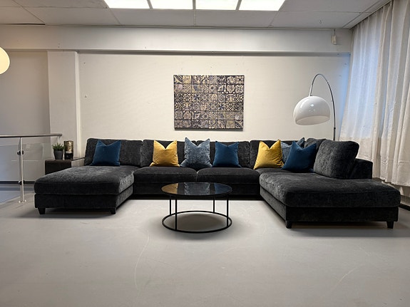 Selger en flott hjørnesofa i blå velour med høyre åpen ende (sett forfra). Sofaen er i meget god stand – både fin og hel – og har en stilfull finish som passer perfekt i moderne hjem.