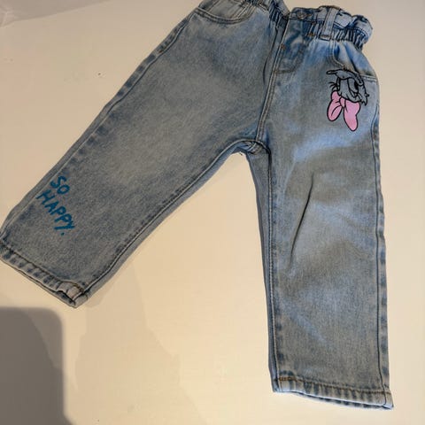 Litt unike, vintage jeans fra tidlig 2000-tallet. Buksen har print og lommer foran og bak. Søtt polkadot belte og mulighet for å justere livet.