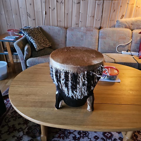 Dekorert håndlaget liten tromme i skinn og tre til salgs.