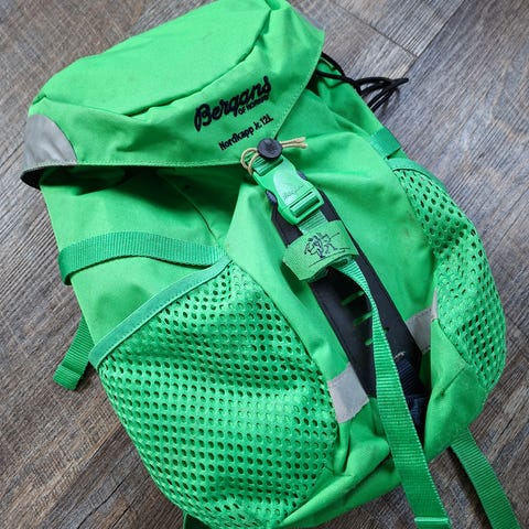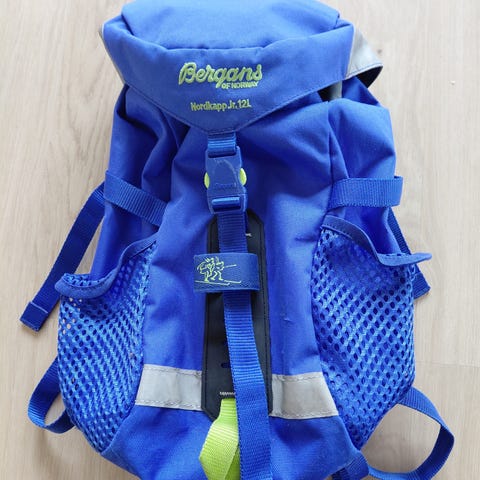 Godt brukt tursekk fra Bergans selges billig! Alle seler og spenner er i orden. Lite hull av glo fra bål på lokket, se bilde 2. Mørk blå med øyenstikkere.