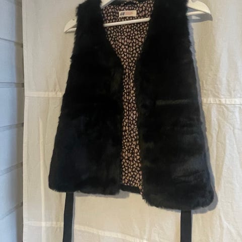 Det er en svart cape i fuskepels med strass-steiner langs kraven, str. 158/164.