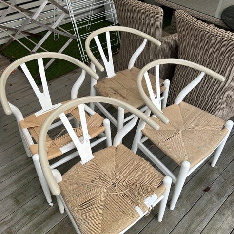 Alt er i god stand/lite slitasje, med unntak av at den ene nakkeputen er festet på nytt, samt at det er et mellomrom mellom ryggspilene og den øverste delen på den ene stolen (se bilder). Mellomrommet er ikke synlig såfremt du ikke bøyer deg ned og ser.