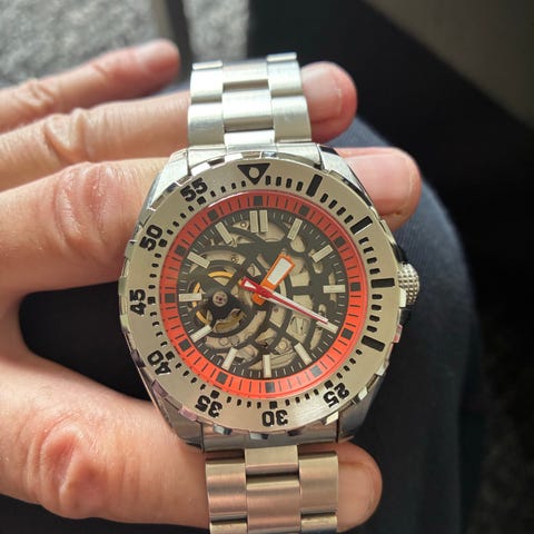 Denne klokken består av: open caseback, nytt nh36 urverk fra Japan, skive, visere, inner-ring, Safir-glass, Bezel, og bezel insert + lenke kommer fra klokker og remer a/s.