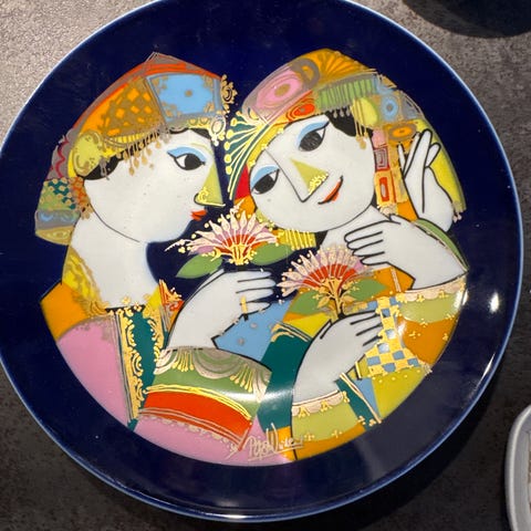 Fargerik keramikkbolle med håndmalt motiv i kunstnerisk stil. Motiv av kvinne med blått hår og teksten "nice & easy". Nydelige detaljer og sterke farger – en dekorativ og sjelden gjenstand.
