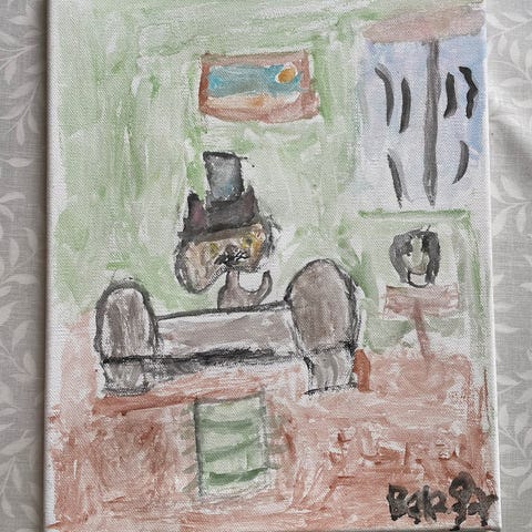 Antakelig akryl og klar lakk, malt på plate. De 2 minste er bemalt på begge sider. Det største er 80x85 cm, de mindre 40x33 og 30x27.