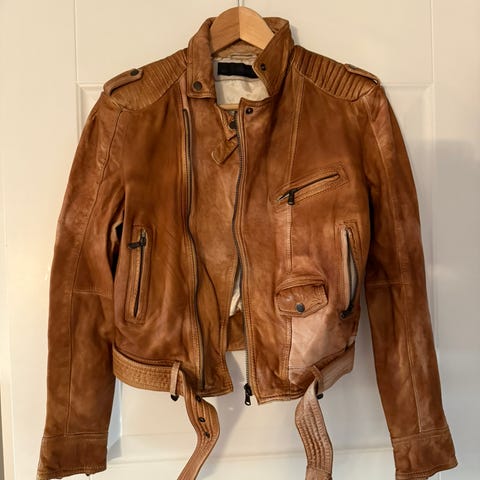 Selger med tungt hjerte en Rock n Blue skinnjakke i størrelse 36, da den er for trang for meg. Den består av både sort skinn og armygrønt tekstil. Den har to glidelåser og en god del stretch i materialet så den passer nok både XSmall og Small. Råtøft jakke som er svensk design.