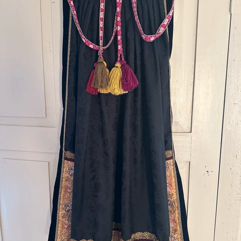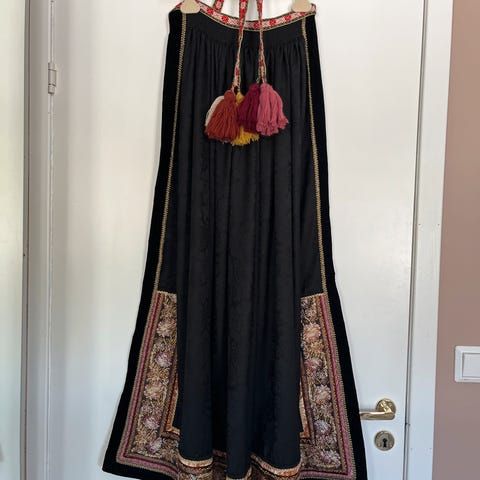 Selger dette nydelige forkleet til beltestakk! Sys ferdig etter ønsket lengde. Nåværende lengde er 106 cm. Bredde der folder er lagt er 35 cm.