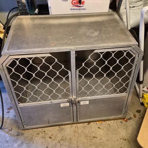 Hundekasse som har stått på henger selges. Topplaten er ikke kjempebra, se bilder. Hundeboksene fremstår som tørr og hel når jeg har kikket inn i de. Dører/hengsler er i orden. Noe tygg rundt dører (se bilder), men hindrer ikke bruk. Et hengsel som var festet til henger ble brukket løs fra kassen, se bilde. Ellers ser platen under ok ut. Kassen er 1.54 bred, listene fremme mot vind/vær bygger 8cm på hver side. Kassen er 2,53m lang og 64cm høy. Hver hundeboks er 75x61cm stor. For flere spørsmål eller bilder er det bare å ta kontakt.