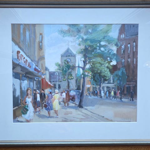 Vakkert og moderne bymotiv i duse grå og grønntoner. Pent rammet inn i en ramme som er nærmere bronse enn gull.