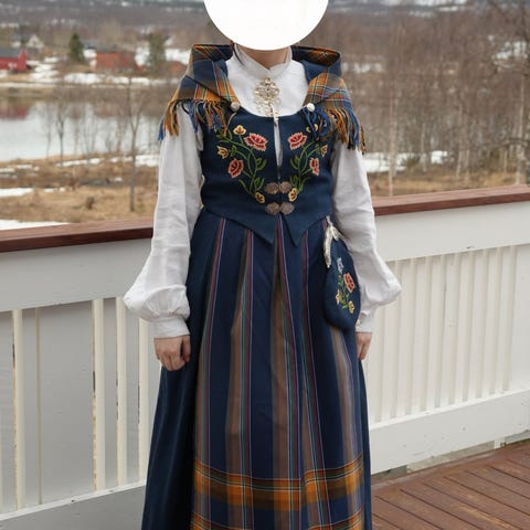 Nordlandsbunad selges med sjal, forkle og veske. Skjorte og søljer medfølger ikke.