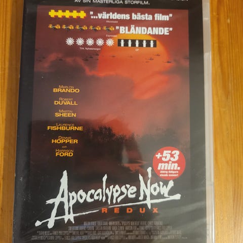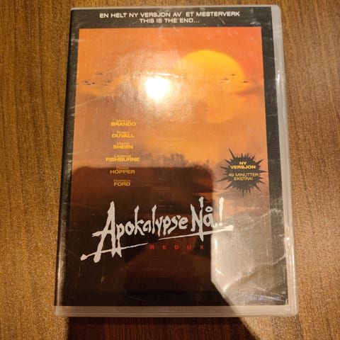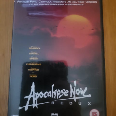 Apocalypse Now Redux DVD Film. Denne utgaven inneholder den utvidede versjonen av den klassiske filmen. Formatet er DVD, og filmen er kjent for sitt ikoniske innhold og visuelle stil.