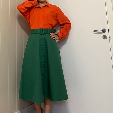 Trendy og flatterende highwaist denimskjørt med splitt bak. Strechy og behagelig kvalitet.