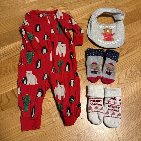 Tre stk. langermet body til baby, alle i størrelse 62, og en smekke, "My first Christmas".
