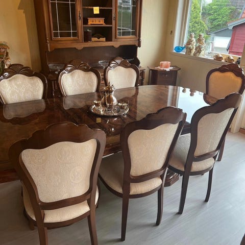 Nydelig, antikk spisestue – bord med tileggsplater som kan bli 225cm, og 4 stoler (marmor overtrekk følger med!)