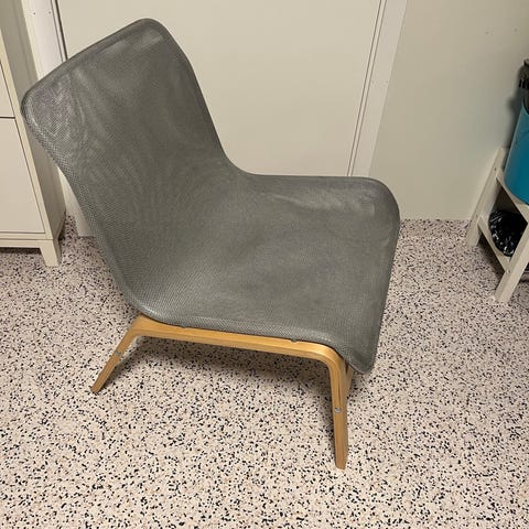 Brukt IKEA TULLSTA lenestol med avtagbart, hvitt trekk, og ryggpute.