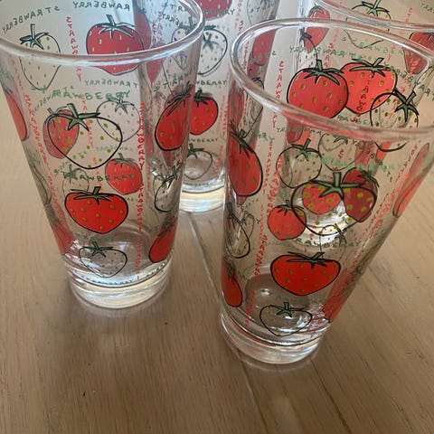 4x asjetter i glass fra Sagaform med jordbærmønster.