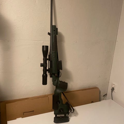 Remington 700 stainless syntetic 22 - 250 REM med Smith and Bender kikkert 1,5 - 6 x 42. Våpen er gjenget for lyddemper. Våpenet er svært lite brukt. Lærreim medfølger. Nypris ca. 28 000 kr. Det medfølger 100 stk. Sako ammo.