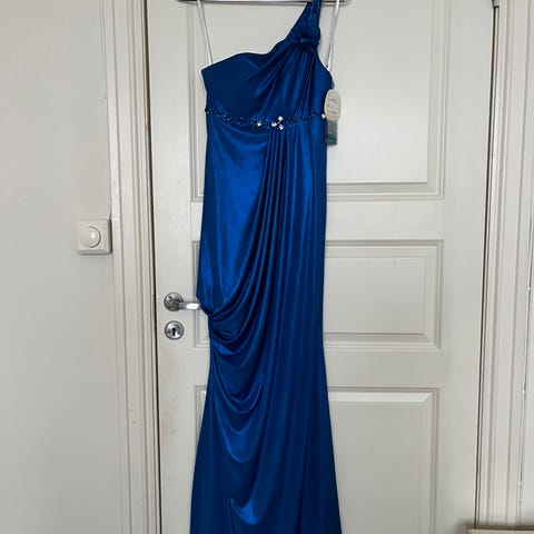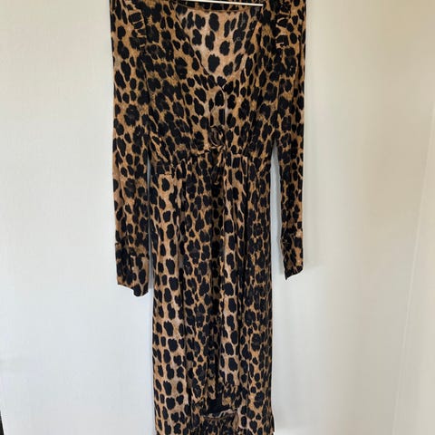 Den har en høy, firkantet halsutringning og en lav rygg, pluss en splitt i benet på den ene siden, og den er midi-lang. Den er knapt brukt og er i utmerket stand.