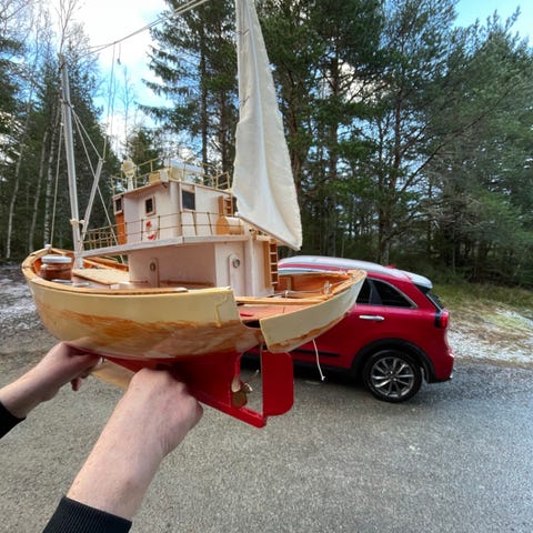 Selger en båt- form - ca70-80 cm lang, ca. 25-30 høy, og ca30 cm bred. Den har veldig fin form. Et eksempel på båt med bauen opp, kan sees på bildet hvor båten er malt rød med sort linje. Åpen for bud, men ikke skambud. Båten vurderes også solgt.