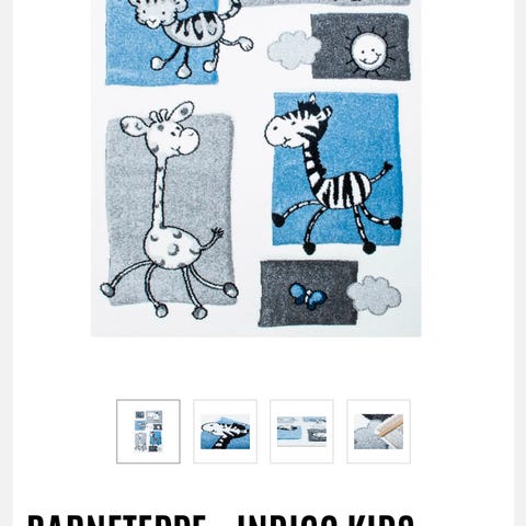 Selger et pent brukt teppe til barnerom i nydelig turkis. Teppet har ingen flekker og er nyvasket. Medfølger tilhørende tog i tre med skogsdyr + romslig oppbevaringspose til leker etc