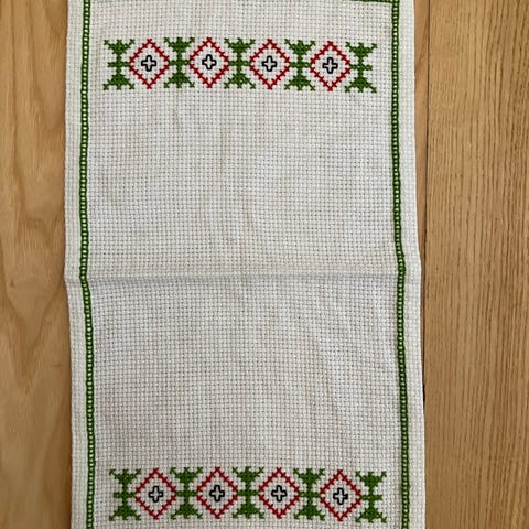 HÅNDARBEID- 1 meget flott løper. Lengen er 72 cm, bredde 27 cm, veier 80 gram. Fargen er lys/lys sandfarget, og brodert med lys beige farge. Det er brodert rundt kanten/i ytterkant på løperen, fargen på garnet er litt mørkere enn på selve løperen. Løperen er nyvasket. Stoffet er litt stivt. Det er et kvalitets materiale (husker ikke navnet på det). Se alle bildene. Løperen kan sendes, eller hentes her i Sandefjord.
