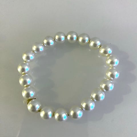 🔍 Nøkkelord: perlearmbånd, vintage armbånd, elastisk armbånd, store perler, klassisk smykke, kostymesmykke, hvite perler, retro armbånd, smykker til fest, brukte smykker