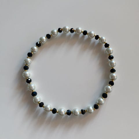 Elastisk armbånd med store, kremhvite perler (ca. 1,8 cm i diameter) og svarte metallhylser med blomstermønster mellom perlene. Passer til både hverdags og fest, og gir et klassisk uttrykk.