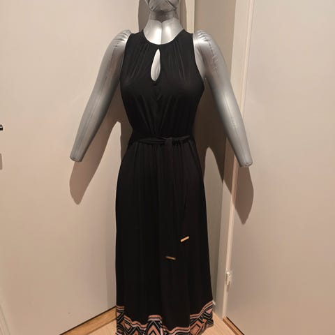 Nydelig maxikjole i str. S, men passformen er elastisk, så den sitter flott på deg som bruker str. 38–40. Kjolen har en dyp split langs på siden, som gir et elegant og sofistikert uttrykk – perfekt både til varme sommerkvelder og mer pyntede anledninger.