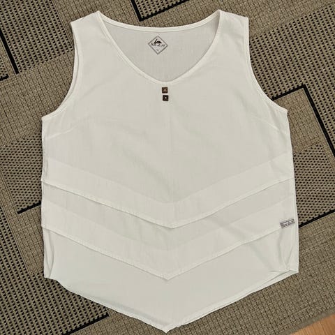 Pen topp, med lyserosa detaljer. 100 % bomull pent brukt. Tynn og god til sommeren. Vær pent kledd samtidig som det er svalt og godt.