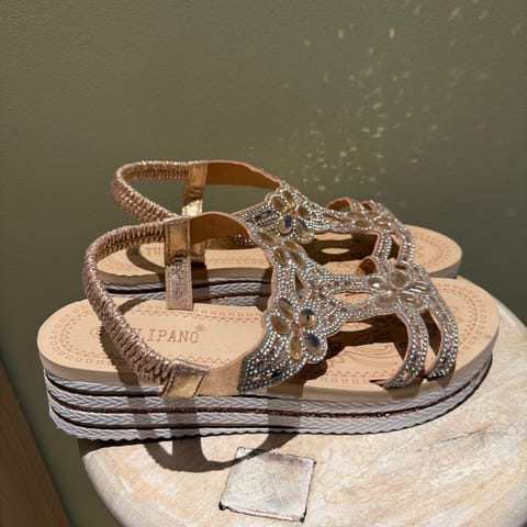 Lekre sandaler i beige med steiner. Sandalene er pent brukt, og er størrelse 38. Jeg sender stort sett alltid første virkedag etter mottatt penger for frakt :)