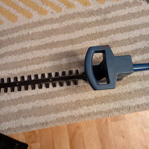 Bosch batteridrevet hekksaks med teleskopstang leies ut for korte perioder. Se lenke: