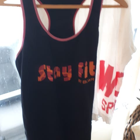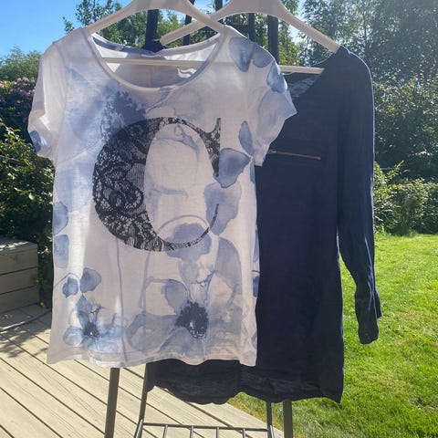 Viskose og elastan. Litt sølvtråd. Mener dette må være en S til M strl