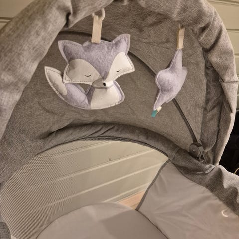 Babyvugge fra Kinderkraft, selges for 350kr. Svært lite brukt, fremstår som ny. Farge: lysegrå. Nypris 1200kr.