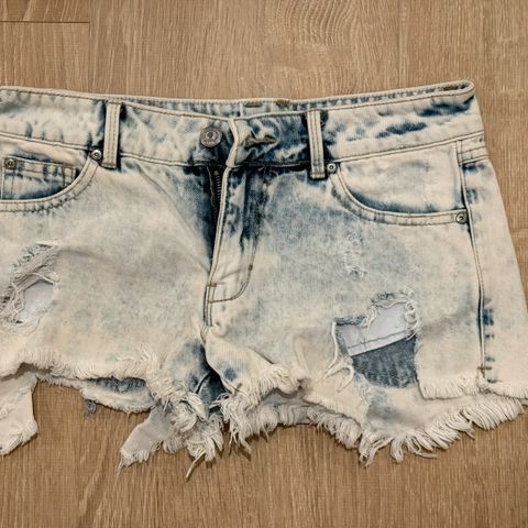 Trendy syrevasket denimshorts. Shortsen er aldri brukt, og er størrelse L men oppleves litt mindre. Materiale: 70% bomull, 28% polyester, 2% elastan. Jeg sender stort sett alltid første virkedag etter mottatt penger for frakt :)