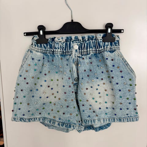 Trendy denimshorts med nagler. Shortsen er aldri brukt, og er størrelse 30 (tilsvarer M/L). Materiale: 100% bomull. Jeg sender stort sett alltid første virkedag etter mottatt penger for frakt :)