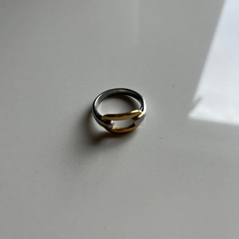 Vær oppmerksom på at ringen er veldig tykk og kan være veldig vanskelig å justere størrelse på. Se bildene for størrelse.