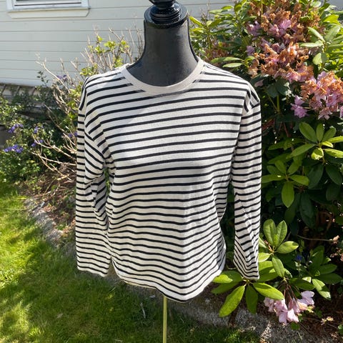 Blå og hvit striper t-skjorte fra Cos. Opprinnelig størrelse M, men jeg opplever den som en vanlig small (jeg bruker M og den er for liten for meg)
