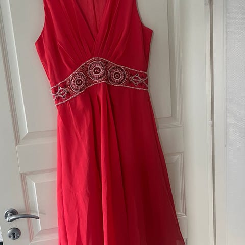 Selger denne nydelige, klassiske, kjolen i str 42. Nydelig snitt, varm rød farge. Fine detaljer med bl.a. blonder og sømmer. Stoffet er eksklusiv kvalitet med litt tyngde som faller fint. Som du kan se på bildene, har stoffet god stretch/ er elastisk, så det føyer seg fint. Veldig behagelig på og krøller seg ikke. Hele kjolen er foret/har underskjørt. Aldri brukt, helt ny og ubrukt, lappen henger forsatt på. Passer til bryllup, selskap, jul eller festkjole. Pris kr 290 kr, nypris kr 1399,- (se bilde)