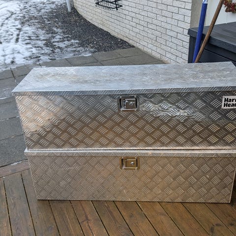 Rød metall oppbevaringskasse med hjul