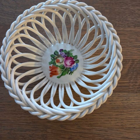 Herend håndlaget kurv med blomsterdekorasjon i porselen. Kurven har en flettet design og er dekorert med fargerike blomster i midten. Egnet som dekorativt element i hjemmet.