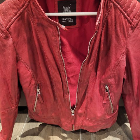 Feminin skinn jakke i deilig kvalitet. Har mistet litt farge på det ene ermet.