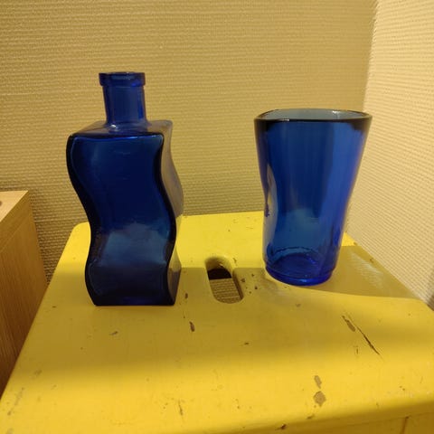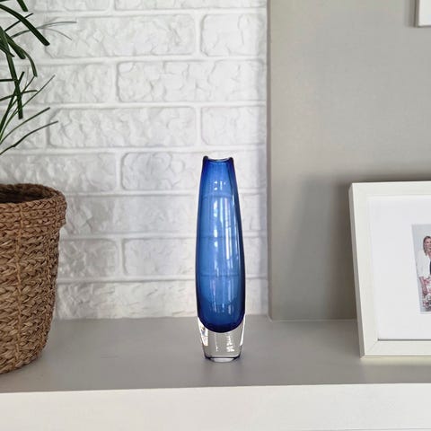 Selger en vakker og unik vase i blått glass. Vasen har et moderne og stilig design, med en bred og flat topp som gir et elegant uttrykk. Den har en unik fargekombinasjon av klart og blått glass. Vasen er perfekt for å vise frem blomster eller som et dekorativt element i seg selv. Den er i meget god stand og vil garantert bli et blikkfang i ethvert hjem.