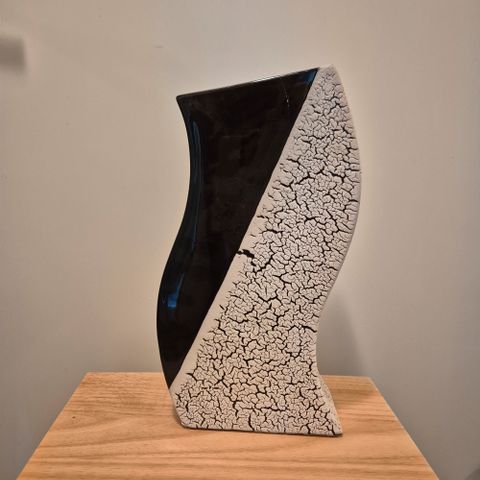 Selger en unik vase. Vasen har en moderne og skulpturell design med en kombinasjon av matte og blanke overflater i fargene hvit, grønn og mørk blå. Den er perfekt for å sette et kunstnerisk preg på hjemmet ditt.