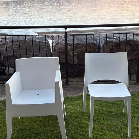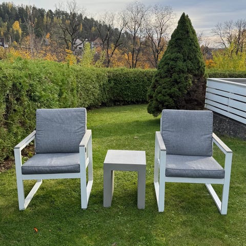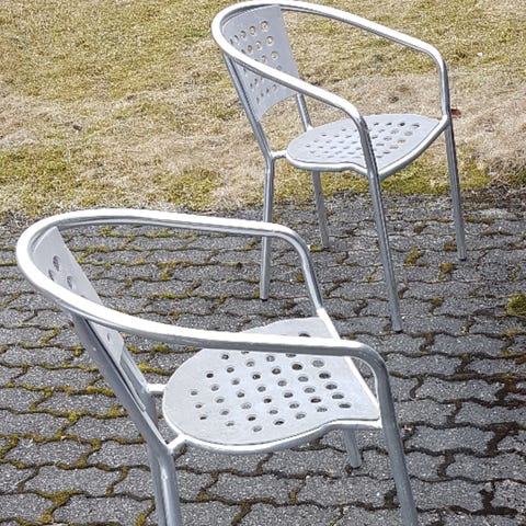 To Skarpø hagestoler selges grunnet overgang til nye hagemøbler. Pent brukt uten store skader, men trenger nok en vaske etter å ha stått ute i vinter.