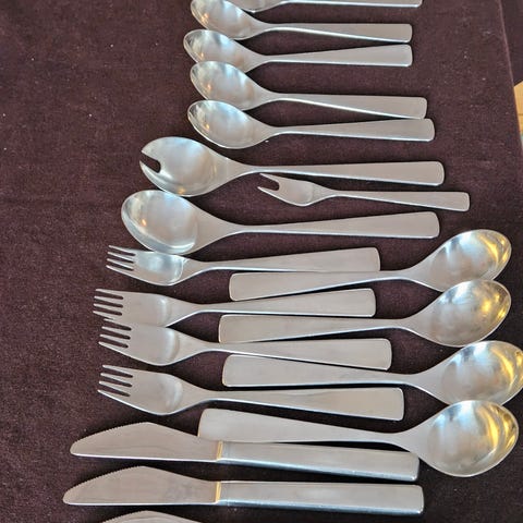 Se foto, kan sendes mot kr 76,-. 12 stk spiseskje, 2 gafler og 2 kniver. Samlet kr 800,-.