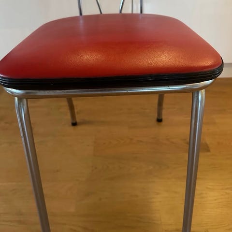 Husmorsstol. Stolen er laget av metall og trekt med rødt plastikksskinn. Setet kan løftes bakover slik at stolen fungerer som en trappestige med tre trinn. Stolen er I veldig god stand.