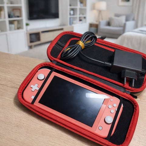 Selger en Nintendo Switch Lite (blĂĽ) i topp stand â alt fungerer perfekt.
