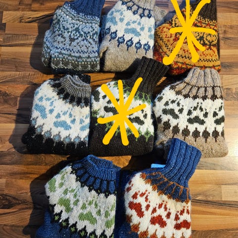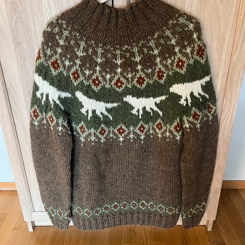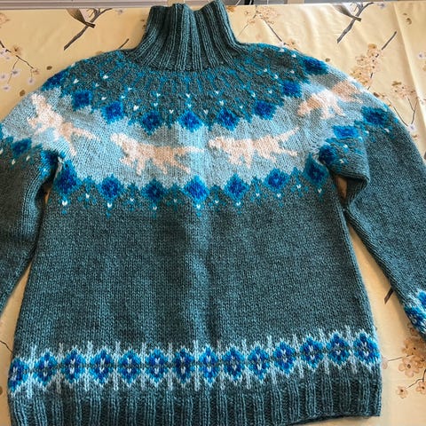 Hjemmestrikket ullgenser (jakthundgenseren) i garn troll og blåne. Meget tykk og varm genser.
