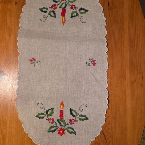 Selger en ubrukt juleduk med broderi. Duken har et fint design med julemotiv. Den er i god stand og kan bidra til å skape en koselig julestemning.